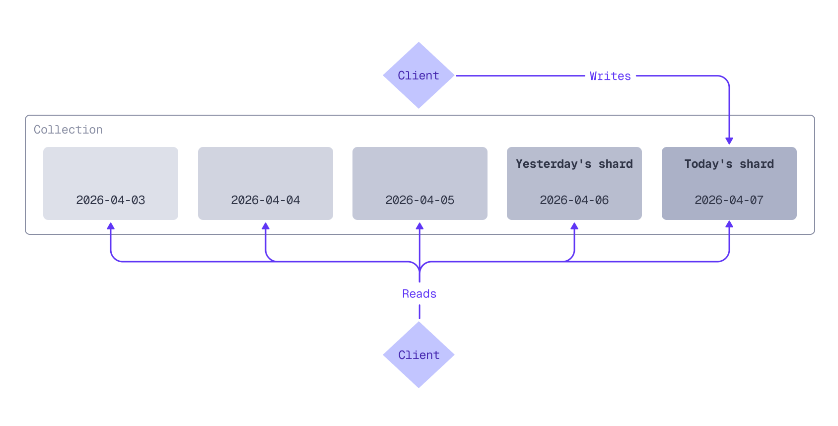 For example, with daily shards, today’s data is stored in today’s shard, yesterday’s data in yesterday’s shard, and so on. Queries can target specific shards (today’s shard, for example) or multiple shards to cover a date range.